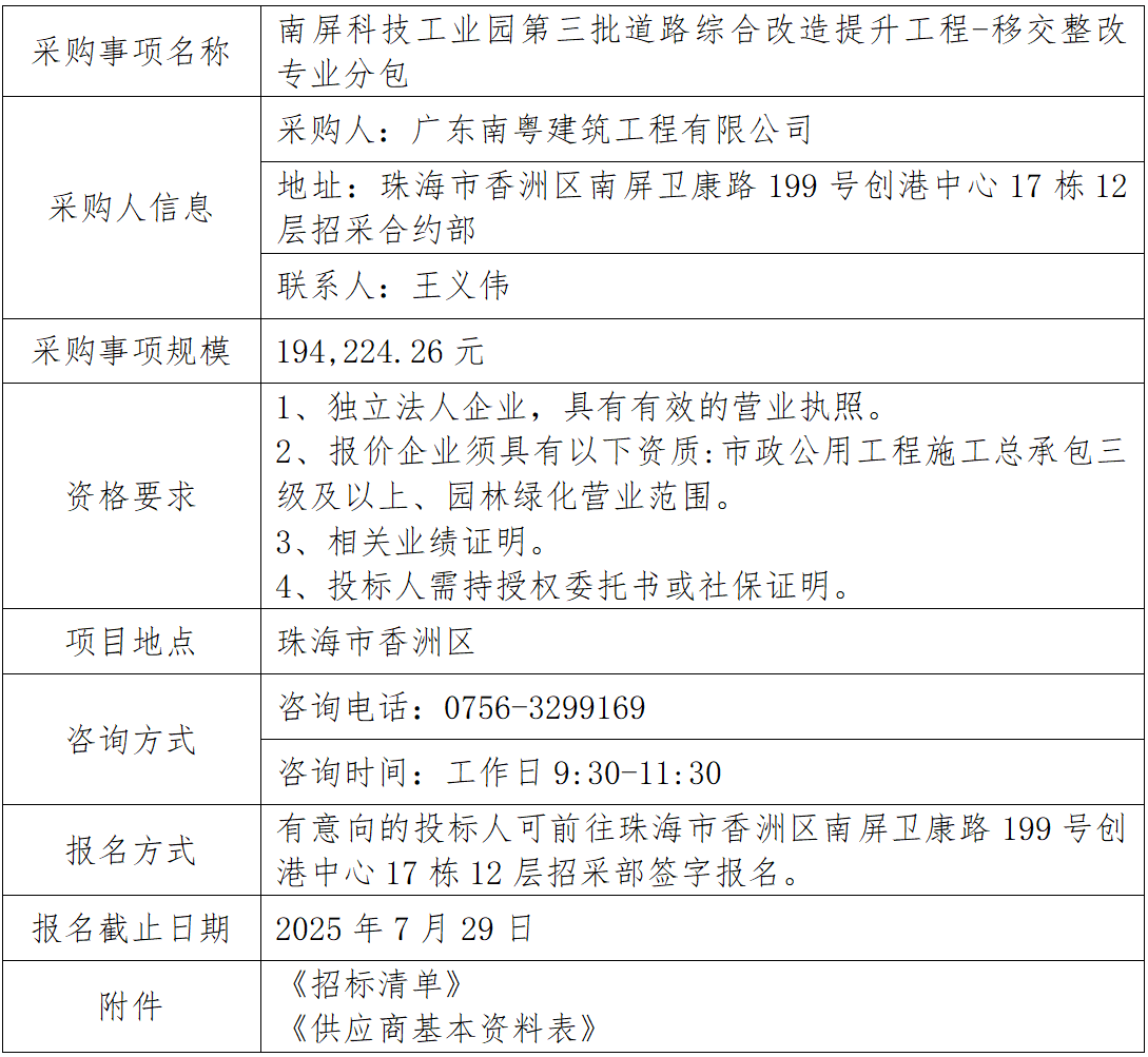 南屏科技工業(yè)園第三批道路綜合改造提升工程-移交整改專業(yè)分包 專欄:工程招標(biāo) 發(fā)布日期: 2025-07-23 作者:招采管理中心 附件:南屏科技工業(yè)園第三批道路綜合改造提升工程-移交整改專業(yè)分包招標(biāo)清單 附件:供應(yīng)商基本資料表 返回列表 上一篇:南屏科技工業(yè)園第三批道路綜合改造提升工程-移交整改專業(yè)分包(延期掛網(wǎng)) 下一篇:南屏科技工業(yè)園第二批道路綜合改造提升工程項目-市政排水管網(wǎng)移交整改(屏北二路飛天利商混路段)專業(yè)分包招標(biāo)