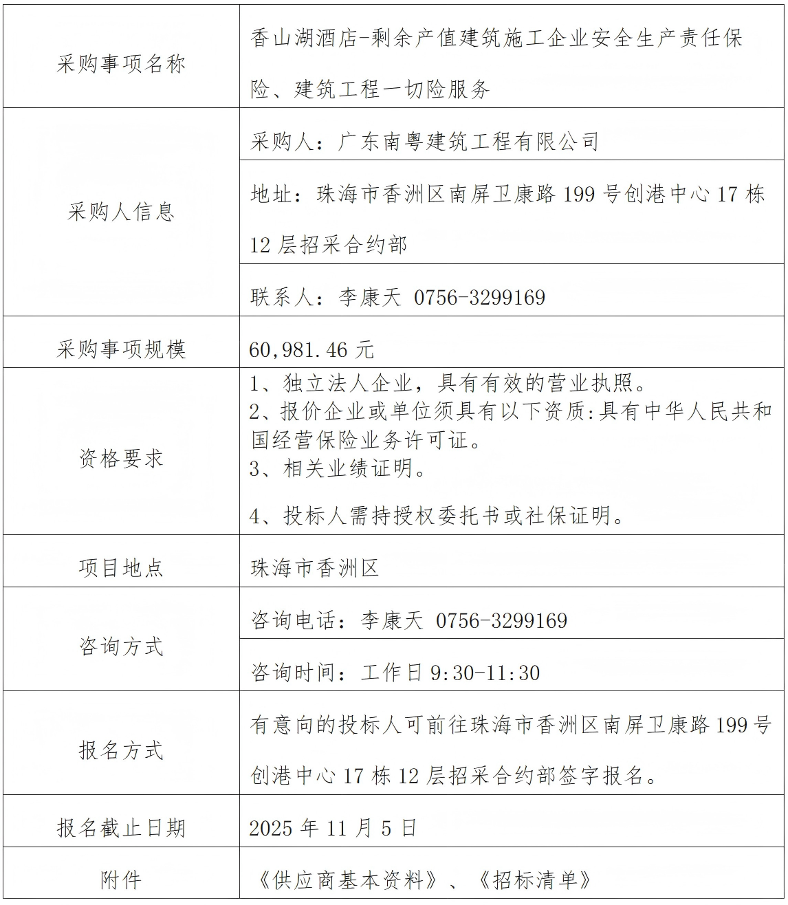 香山湖酒店-剩余產(chǎn)值建筑施工企業(yè)安全生產(chǎn)責(zé)任保險(xiǎn)、建筑工程一切險(xiǎn)服務(wù) 專(zhuān)欄:工程招標(biāo) 發(fā)布日期: 2025-10-31 作者:招采管理中心 附件:供應(yīng)商基本資料表 附件:香山迎賓館(現(xiàn)已變更為香山湖酒店)項(xiàng)目施工總承包延期-工程一切險(xiǎn)及安責(zé)險(xiǎn)保險(xiǎn)服務(wù)招標(biāo)清單 返回列表 上一篇:鳳凰山山地步道項(xiàng)目(香山湖公園至海天公園段)-全線整改、維修工程專(zhuān)業(yè)分包(延期公示) 下一篇:廣昌保障房配套基礎(chǔ)設(shè)施項(xiàng)目施工總承包工程一切險(xiǎn)、建筑施工企業(yè)安全生產(chǎn)責(zé)任保險(xiǎn)(第二次)