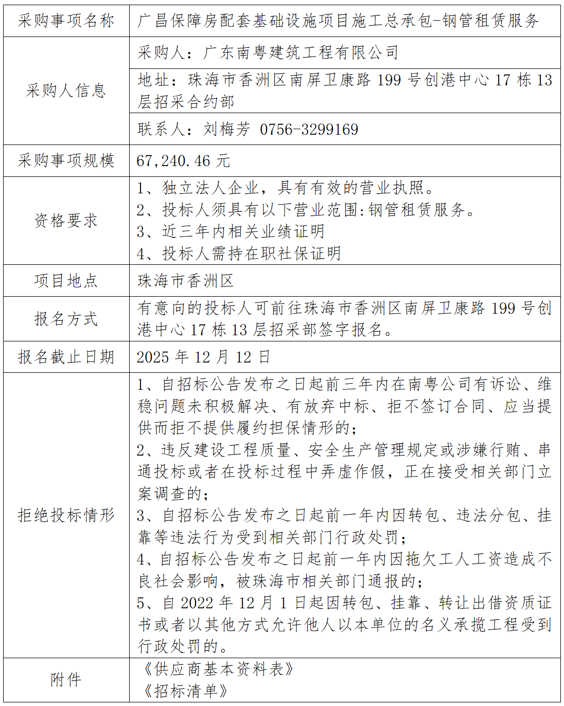廣昌保障房配套基礎(chǔ)設(shè)施項(xiàng)目施工總承包-鋼管租賃服務(wù) 專欄:工程招標(biāo) 發(fā)布日期: 2025-12-09 作者:招采管理中心 附件:供應(yīng)商基本資料表 附件:廣昌保障房配套基礎(chǔ)設(shè)施項(xiàng)目施工總承包-鋼管租賃服務(wù)招標(biāo)預(yù)算清單 -空白清單 返回列表 上一篇:廣昌保障房配套基礎(chǔ)設(shè)施項(xiàng)目施工總承包-地材材料采購(gòu)招標(biāo)(延期掛網(wǎng)) 下一篇:廣昌保障房配套基礎(chǔ)設(shè)施項(xiàng)目施工總承包--土建勞務(wù)分包(均昌路+廣灣街)