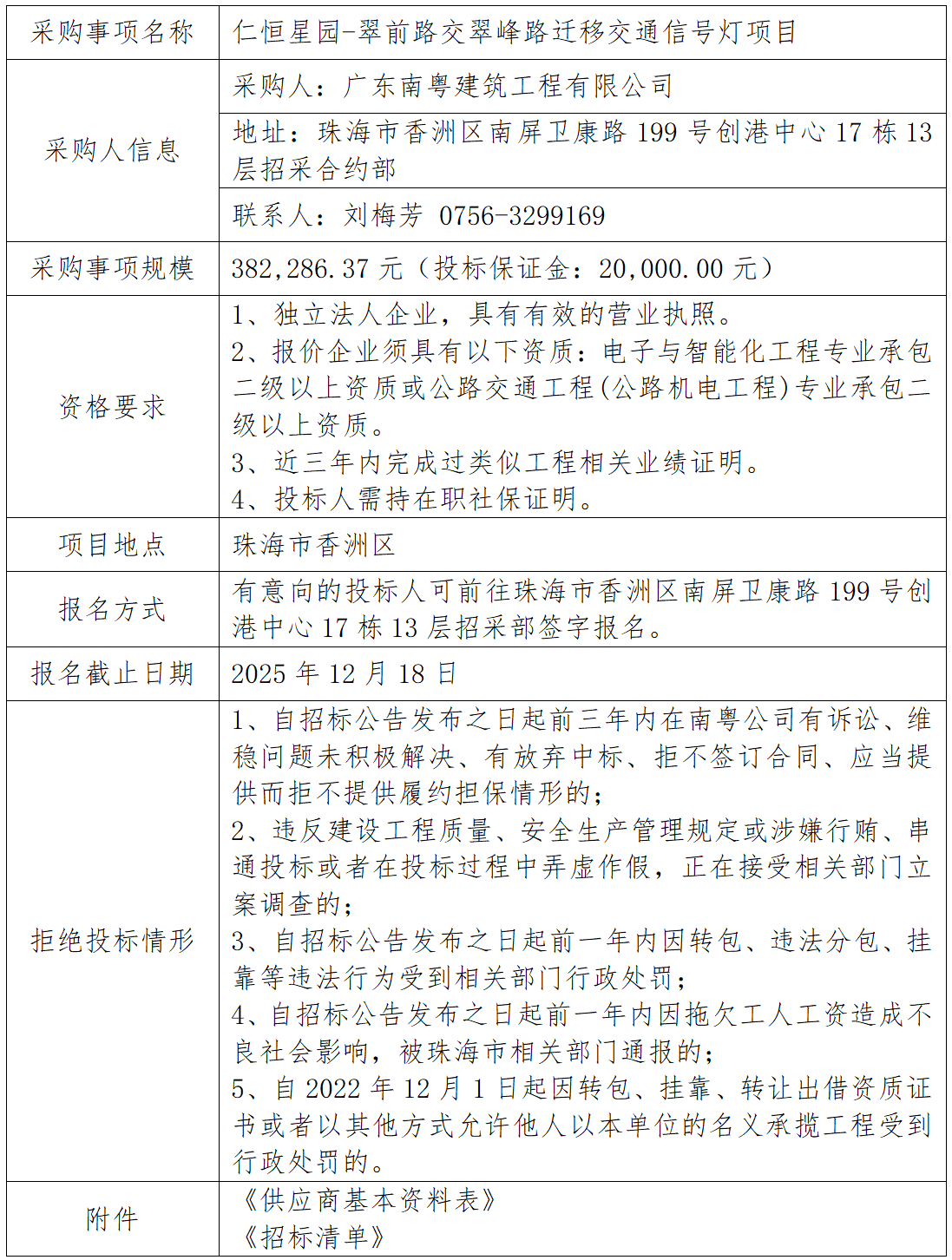 仁恒星園-翠前路交翠峰路遷移交通信號(hào)燈項(xiàng)目 專欄:工程招標(biāo) 發(fā)布日期: 2025-12-15 作者:招采管理中心 附件:供應(yīng)商基本資料表 附件:三臺(tái)石路仁恒星園-翠前路交翠峰路遷移交通信號(hào)燈項(xiàng)目-招標(biāo)預(yù)算價(jià)清單 返回列表 上一篇:廣昌保障房配套基礎(chǔ)設(shè)施項(xiàng)目施工總承包-預(yù)制水泥類材料采購(gòu)招標(biāo) 下一篇:廣昌保障房配套基礎(chǔ)設(shè)施項(xiàng)目施工總承包-混凝土材料采購(gòu)(預(yù)算、稅率變更)