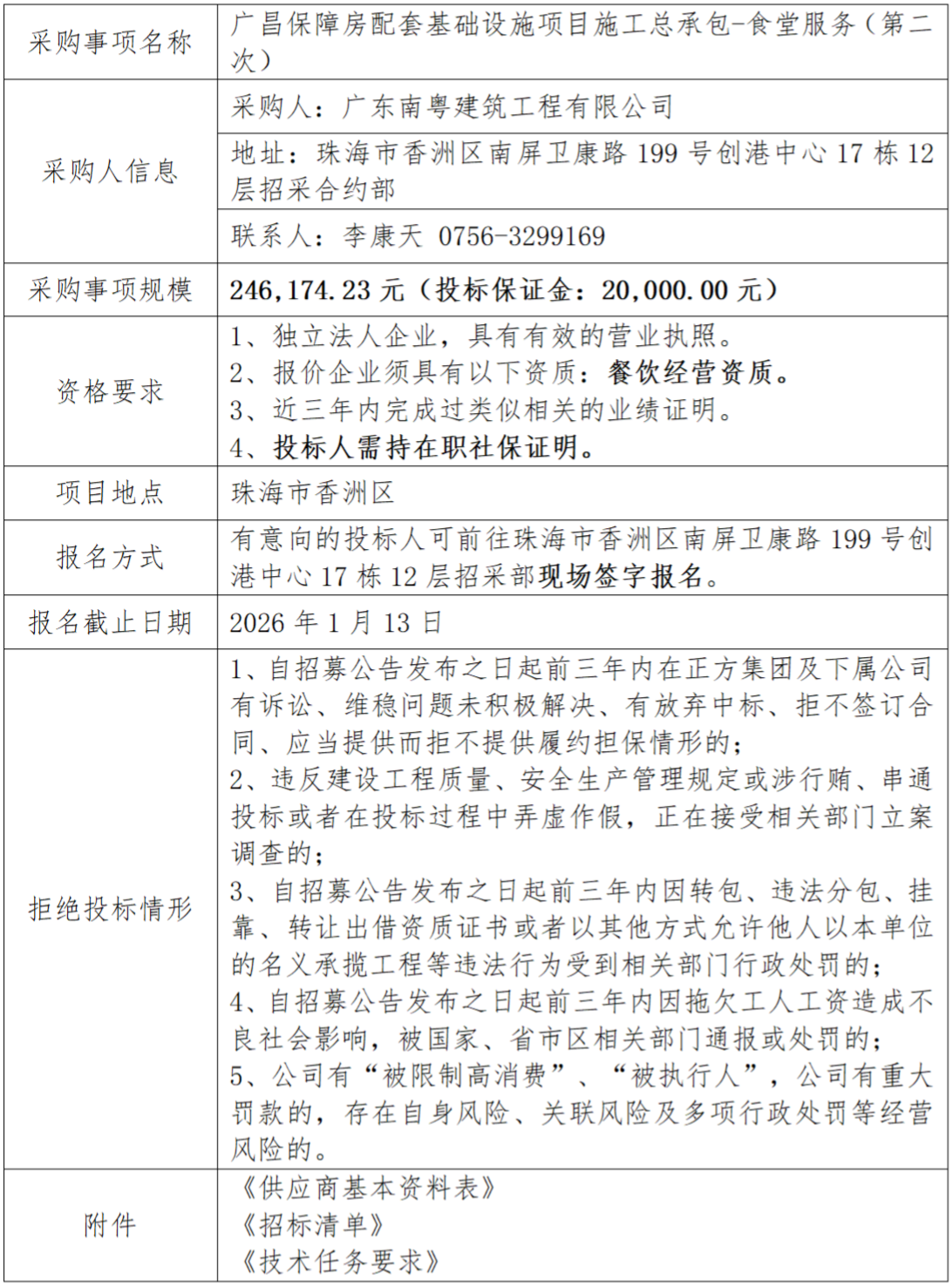 廣昌保障房配套基礎(chǔ)設(shè)施項目施工總承包-食堂服務(wù)(第二次) 專欄:工程招標 發(fā)布日期: 2026-01-08 作者:招采管理中心 附件:供應(yīng)商基本資料表 附件:廣昌保障房配套基礎(chǔ)設(shè)施項目施工總承包-食堂服務(wù) - 空白清單 附件:廣昌保障房配套基礎(chǔ)設(shè)施項目施工總承包-食堂服務(wù)招標要求 返回列表 上一篇:廣昌保障房配套基礎(chǔ)設(shè)施項目施工總承包--土石方工程專業(yè)分包(第二次) 下一篇:廣昌保障房配套基礎(chǔ)設(shè)施項目施工總承包--交通、安監(jiān)工程專業(yè)分包(第二次)