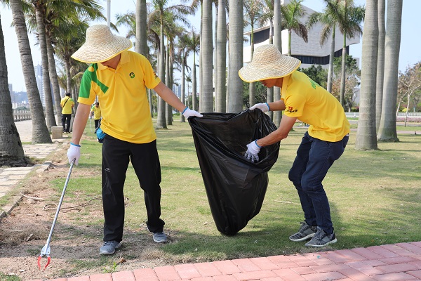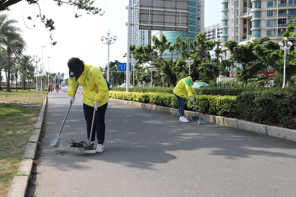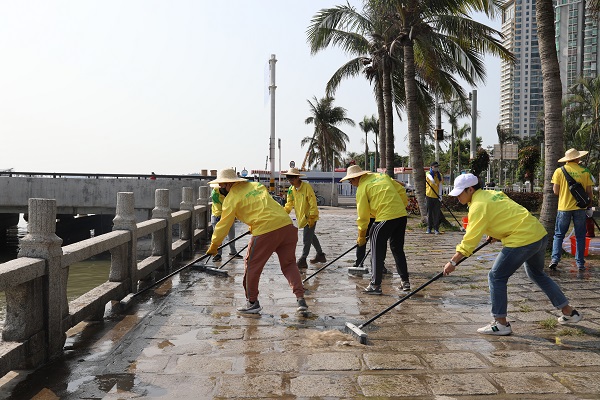 當(dāng)天上午8點(diǎn)40分,各支援人員已在海峽社區(qū)公園小廣場(chǎng)前集合完畢。講清注意事項(xiàng)后,各組人員就在小組長的帶領(lǐng)下簽領(lǐng)好工具前往自己所負(fù)責(zé)的工作區(qū)域內(nèi)迅速開展工作,長長的情侶路立馬被“小黃人”們占領(lǐng)。