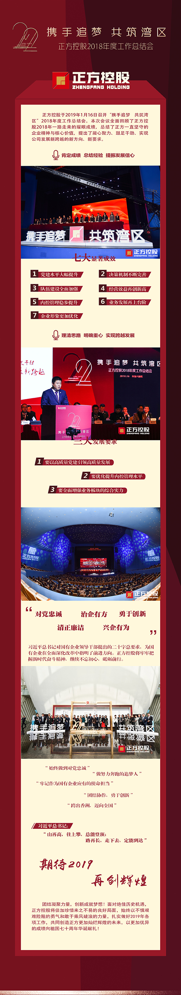 2019年是正方實(shí)現(xiàn)跨越式發(fā)展的重要一年,我們將堅(jiān)持以習(xí)近平新時(shí)代中國(guó)特色社會(huì)主義思想為指導(dǎo),做努力奔跑的追夢(mèng)人,始終做到“對(duì)黨忠誠(chéng)、勇于創(chuàng)新、治企有方、興企有為、清正廉潔”,繼續(xù)圍繞珠海市“二次創(chuàng)業(yè)”總目標(biāo),振奮精神,滿懷激情,以高質(zhì)量黨建為基礎(chǔ),以人才梯隊(duì)優(yōu)化轉(zhuǎn)型為抓手,以業(yè)務(wù)大發(fā)展為手段,從高質(zhì)量黨建引領(lǐng)高質(zhì)量發(fā)展、以高水平管理促進(jìn)高水平發(fā)展、全面增強(qiáng)業(yè)務(wù)板塊的綜合實(shí)力三個(gè)方面出發(fā),扎實(shí)做好2019年各項(xiàng)工作,努力實(shí)現(xiàn)公司更高質(zhì)量、更有效益、更可持續(xù)的發(fā)展。