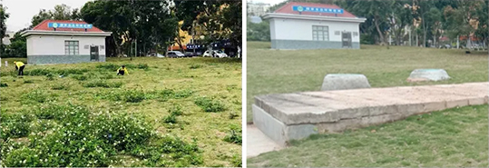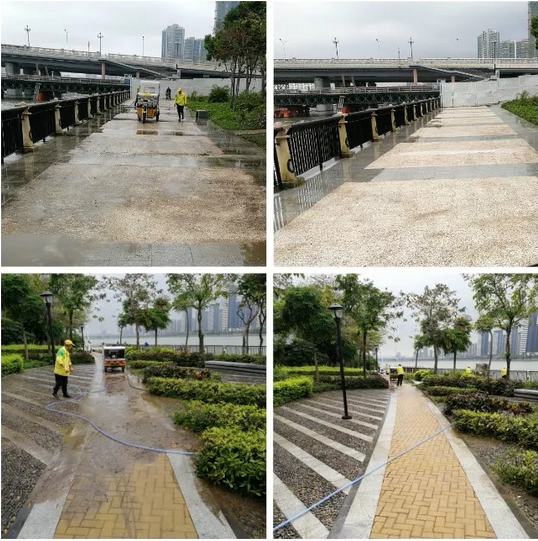僅經(jīng)過一天的奮戰(zhàn),進駐團隊就已完成路面清洗3500平方米,垃圾清運 3車,草坪修剪1500平方米,綠籬修剪800平方米 ,大型樹木修剪53棵,2座公廁已完成深度保潔。