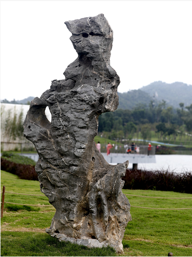 記者看到,在園區(qū)向日葵花海旁,立著一塊近2米高、約6噸重的太湖石;另一側,高大羅漢松景觀樹木旁則“側臥”了一塊高逾1米、重達13噸,形似“睡美人”的景觀太湖石,給園區(qū)增添了一道別致的景觀。