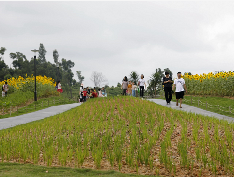 據(jù)介紹,香洲正方在公園環(huán)湖路附近開墾出一片“都市田園”,成為市民游客來公園必到打卡地。截至目前,這片“都市田園”總面積達1500平方米,包括400平方米的向日葵、600平方米的百日菊,還有番茄、旱稻、南瓜等農(nóng)作物。希望通過“都市田園”的開辟,讓小朋友們能夠近距離地接觸到大自然,了解書本里的農(nóng)作物,逐漸將其打造成園區(qū)的一個城市科普基地。