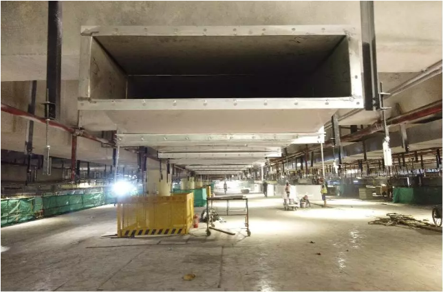 地下通道環(huán)境密閉,且原有通風(fēng)設(shè)施已完全癱瘓,汽車尾氣、施工廢氣等氣體難以排出,施工環(huán)境平均溫度比地面高5到6攝氏度。但這些并沒有阻礙工程進(jìn)度,為保障施工人員安全,香洲正方設(shè)置了12臺(tái)排風(fēng)機(jī),排出通道中的廢氣。同時(shí),采用已經(jīng)焊接完成的施工平臺(tái)部件,減少因組裝產(chǎn)生的廢氣。