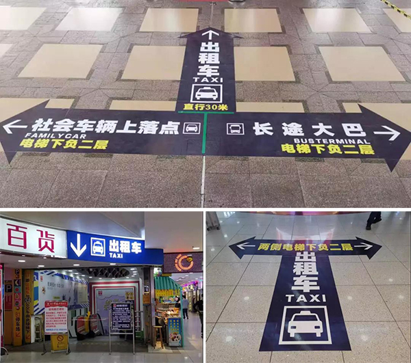 為更好地引導旅客乘坐出租車,拱北口岸綜管辦在口岸購物廣場負一層多處設置了醒目的指示標識,指引旅客前往負二層出租車候車區(qū)。出租車接送乘客,需從東側(cè)情侶路進入地下通道北側(cè)輔道,從而減少了迎賓路華潤萬家路段的出租車流量,減輕該區(qū)域的交通擁堵。