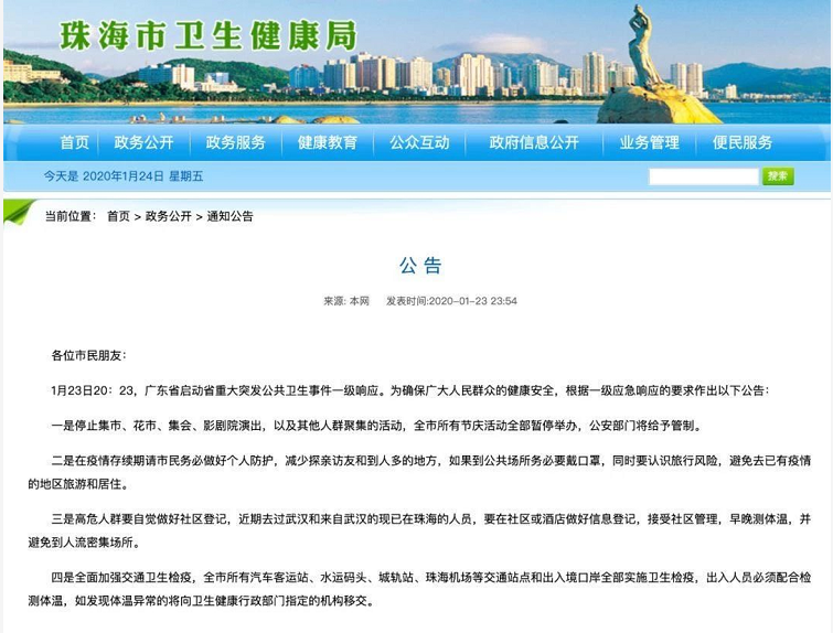 1月23日20:23,廣東省啟動(dòng)省重大突發(fā)公共衛(wèi)生事件一級響應(yīng)。為確保廣大人民群眾的健康安全,根據(jù)一級應(yīng)急響應(yīng)的要求作出以下公告: