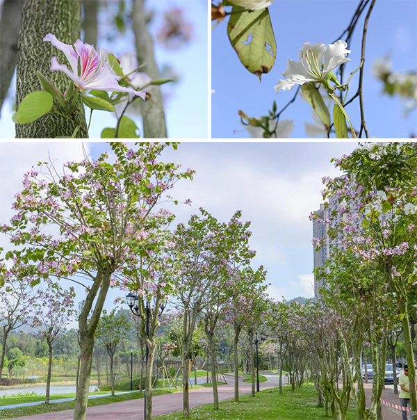 宮粉紫荊、白花羊蹄甲,一樹一樹的粉色、白色悄然蔓延,為城市涂上浪漫的基色,枝頭新綠與藍天輝映,等云舒,等風來。
