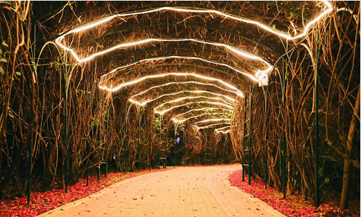 馬燈、鳥巢燈、滿天星、熊貓燈、五彩燈閃耀在林間,游園小徑路口的投影燈幻化出奇異的景色。讓市民游客在夜間安全的環(huán)境下,盡情感受公園夜景的無窮魅力。
