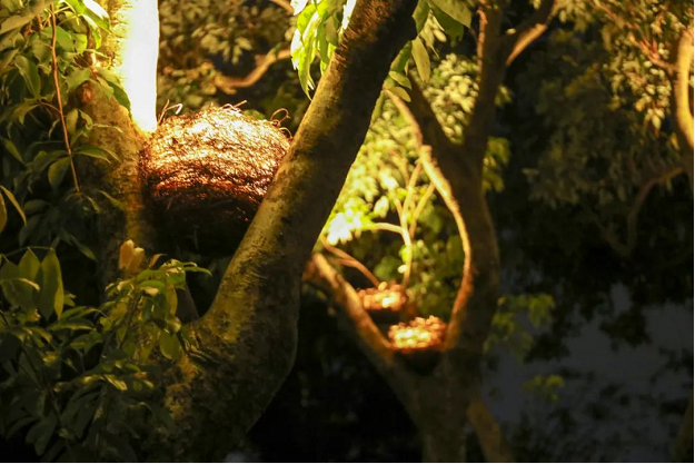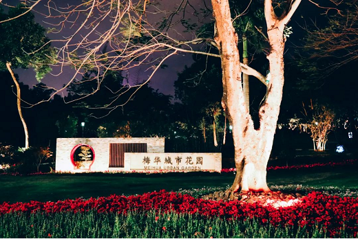 入夜,華燈初上,梅華城市花園泛起點點星光,靜謐溫馨,造型燈勾勒出大樹優(yōu)美弧線。