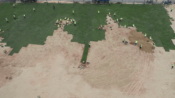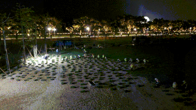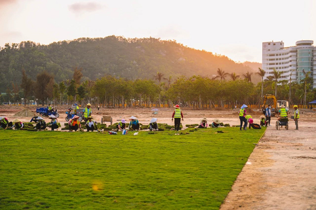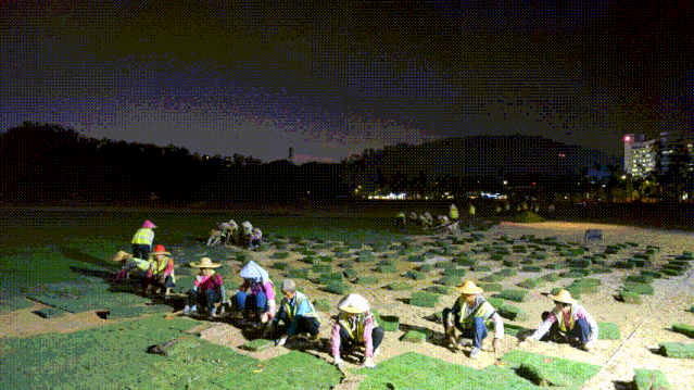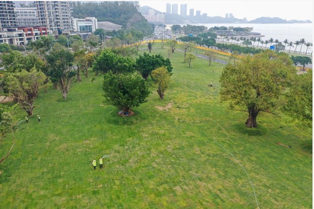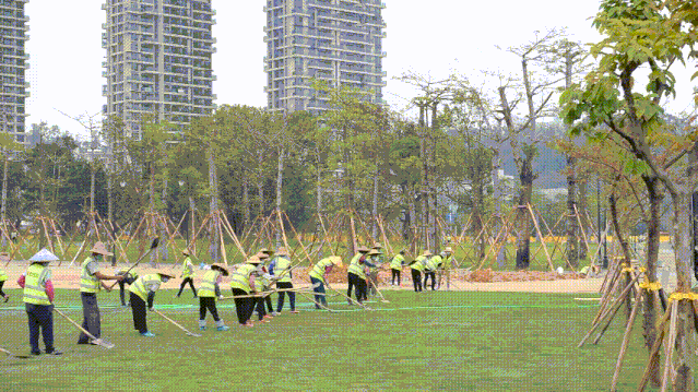 目前,海天公園管養(yǎng)提升項(xiàng)目進(jìn)度已完成75%,各種機(jī)械正在如火如荼運(yùn)轉(zhuǎn),各項(xiàng)工作正在快速有序推進(jìn)。其中,公園東部靠海天驛站一側(cè)已完成臺(tái)灣草草坪鋪設(shè),呈現(xiàn)出碧草茵茵的風(fēng)貌。在中央大草坪的鋪設(shè)現(xiàn)場(chǎng),只見(jiàn)百余工人正在快速鋪草、壓土,一會(huì)功夫一塊平整無(wú)縫的新草坪就呈現(xiàn)在眾人眼前。