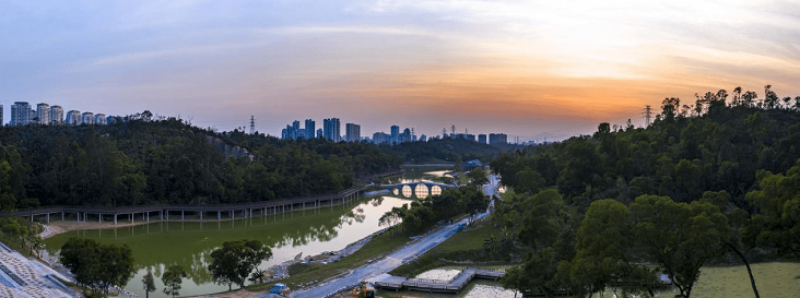 公園定位為嶺南園林建筑山水園,遵循“雖由人作,宛自天成”的主題,橋曲欄回、亭臺樓榭、貽水石橋、湖渡輝映,展現(xiàn)清雅秀麗的南國風(fēng)光,打造一個與生態(tài)風(fēng)貌相協(xié)調(diào),兼顧功能性、景觀性和藝術(shù)性的國際化高水平低碳休閑城市公園。