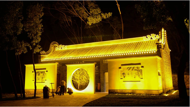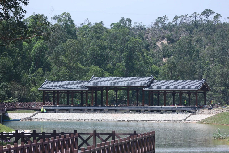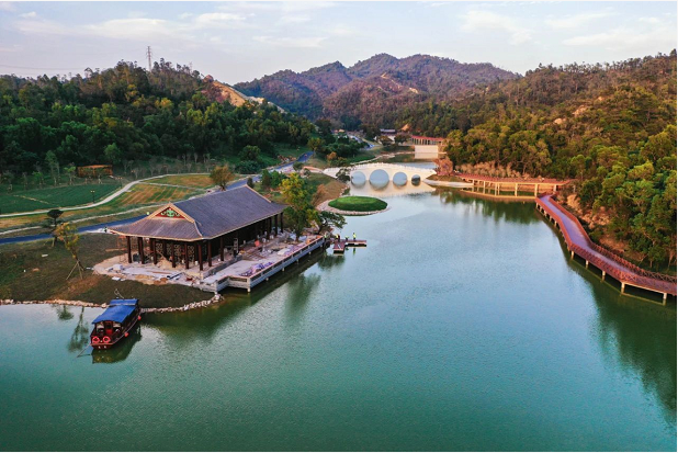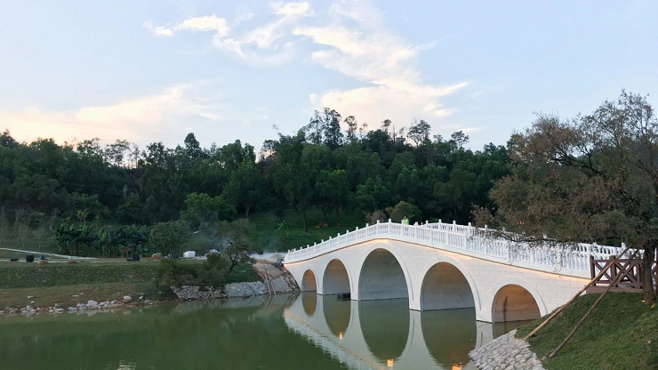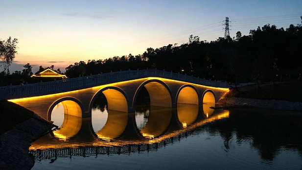 往前走可通過(guò)開(kāi)闊的湖面,遠(yuǎn)觀嶺南風(fēng)格景觀的月門、水榭、五孔橋,月門將瀲滟湖水與青蔥山林優(yōu)美分割,形成極簡(jiǎn)的禪意味。