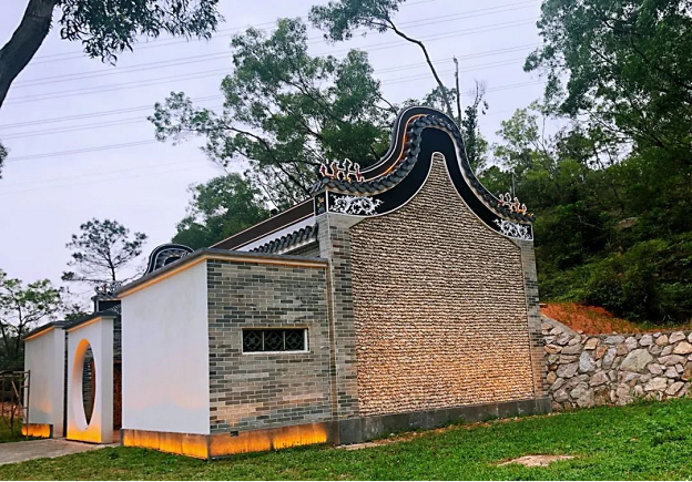 即使是藏身于一旁的衛(wèi)生間,設(shè)計(jì)上也獨(dú)具匠心——屋檐屋脊均采用灰塑裝飾,建筑山墻采用嶺南特色的鑊耳墻、蠔殼墻、花窗裝飾,十分精致。