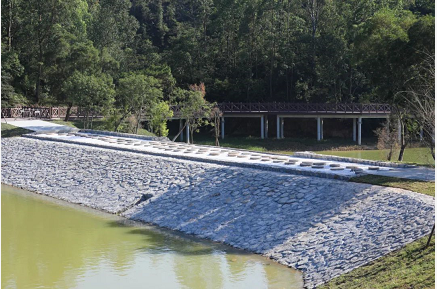 繼續(xù)前行,跌水廊橋橫跨于湖面,坐落在原有的堤壩之上,連接對(duì)面的登山步道。游客登山下來(lái)經(jīng)過(guò)此處,可坐在廊橋兩側(cè)乘涼吹風(fēng),觀看湖景,好不愜意。