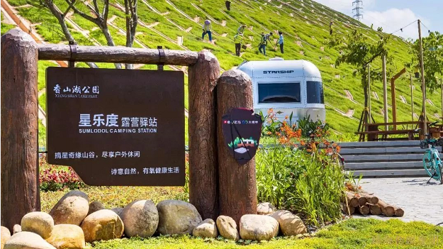 從瀑布折回,沿著依山而建的青石板步道向前,就能看到香山湖·星樂(lè)度露營(yíng)驛站。市民可以一邊品嘗美食,一邊體驗(yàn)戶外露營(yíng)文化、房車文化,了解自然科普知識(shí)。