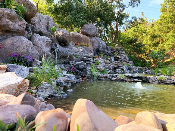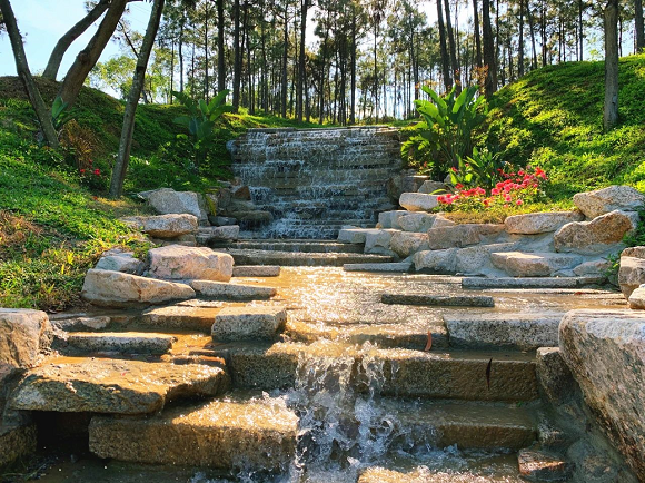 水源方面,保留鳳凰山生態(tài)水資源的基礎(chǔ)上因地制宜,保留天然瀑布,順山勢(shì)跌級(jí)打造山泉湖水,修建環(huán)湖碧水棧道,建造人工噴泉,營(yíng)造親水賞玩空間。修建攔水壩,兼具截水蓄水功能和景觀美感。