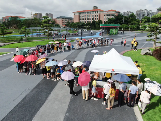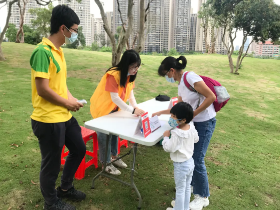 在活動開始之前,小朋友和家長們經(jīng)過工作人員測量體溫、掃描粵康碼登記等防疫檢查。