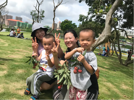 有的小朋友和爸爸媽媽炫耀著“新鮮出爐”的荔枝,分享喜悅;有的和朋友們在林中互相追趕,肆意玩耍;還有的跟其他小朋友們分享著自己摘來的荔枝,結(jié)交新的小玩伴,好不熱鬧~