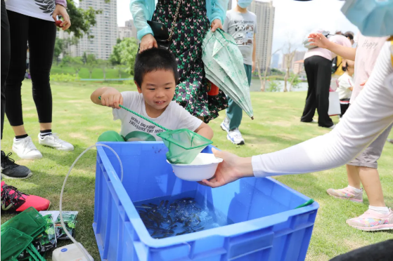 小朋友們仔細(xì)地捧著小魚,在家長的陪同下一路護(hù)送到湖邊。