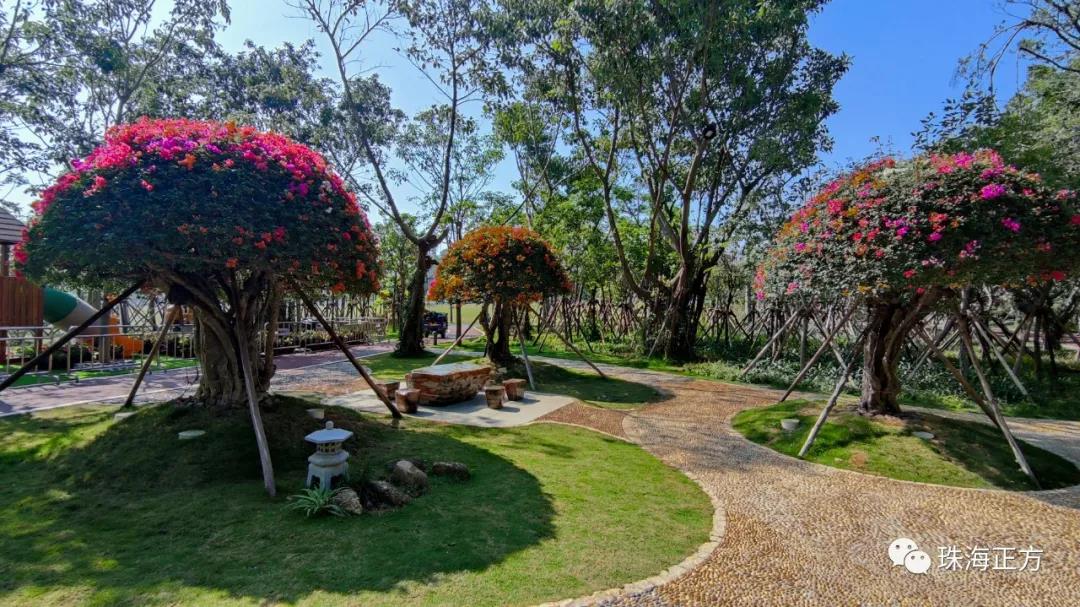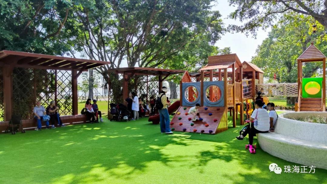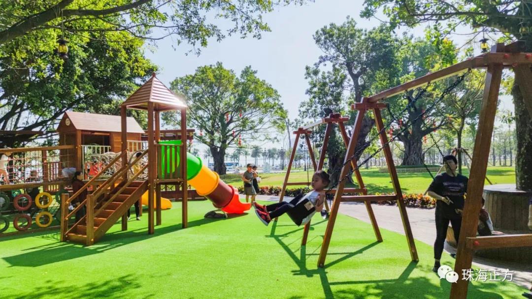 在游園賞景的同時,為增添公園的互動性和趣味性。香洲正方還貼心在古樹名木區(qū)增設(shè)了兒童樂園,滿足孩子們的玩樂需求。