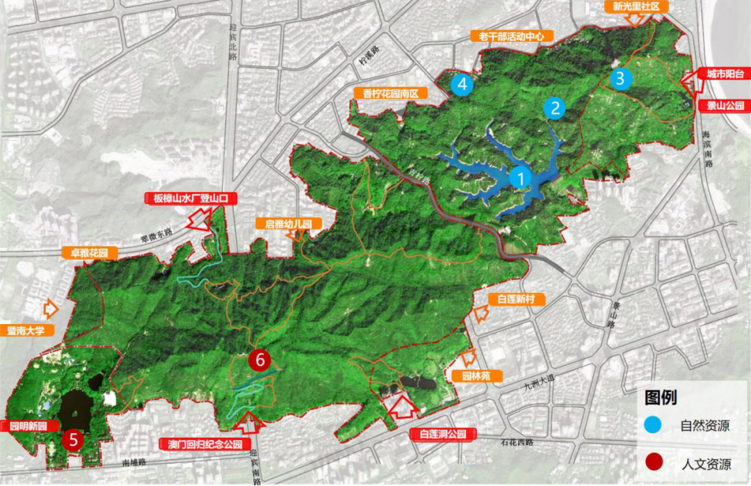 板樟山山地步道沿板樟山南面山腰而建,全線長8553米。根據(jù)不同風景特色分為串園、攬山、觀海三個主題段,自西向東串聯(lián)起圓明新園、澳門回歸公園、白蓮洞公園、吉大水庫、景山公園,直至城市陽臺,打造通山、達海、串園的無障礙特色山地步道。