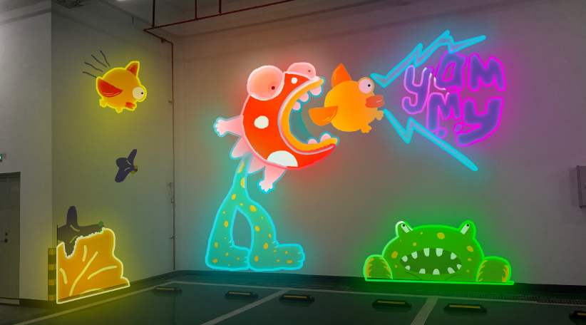 場(chǎng)內(nèi)一共繪制了7組壁畫,高度近4米。更別致的是,壁畫以外還加裝了霓虹燈帶,提升了壁畫的視覺沖擊力,搞怪有趣,十分可愛。