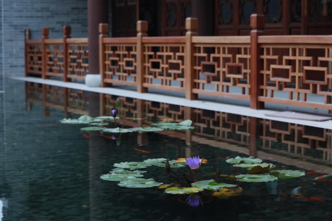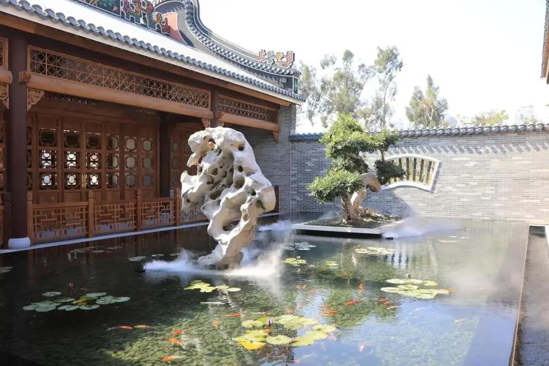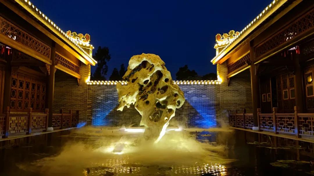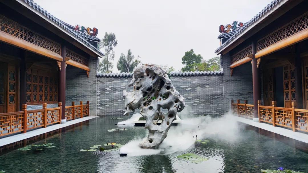 池中央矗立著一個(gè)造型獨(dú)特的“怪石”,陣陣煙霧隨風(fēng)而散,含苞待放的荷花在“飄飄仙氣”的廊院內(nèi)有一種朦朧的美感。