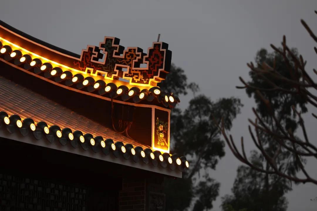香山湖三期的嶺南建筑燈光工程巧妙地將2400盞瓦楞燈和2350盞菊花燈安裝在屋頂和連梁處,白天與廊院的鑊耳山墻、博古灰塑脊融為一體,夜晚的燈光勾勒出屋頂、連梁的線(xiàn)條,使整組古建筑體現(xiàn)出端正沉穩(wěn)、格調(diào)優(yōu)雅的氣質(zhì)。