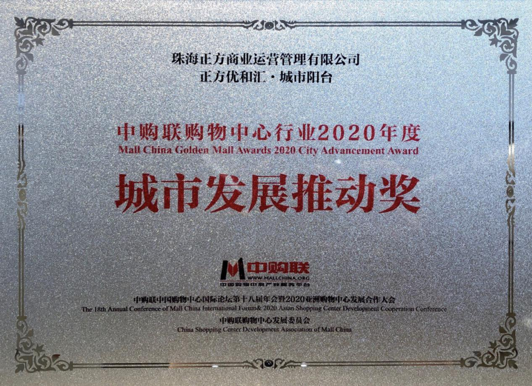 10月22日,在亞洲購(gòu)物中心協(xié)會(huì)暨中購(gòu)聯(lián)2020年度頒獎(jiǎng)典禮上,珠海正方商業(yè)運(yùn)營(yíng)管理有限公司榮膺“中購(gòu)聯(lián)購(gòu)物中心行業(yè)2020年度城市發(fā)展推動(dòng)獎(jiǎng)”,并連續(xù)兩年蟬聯(lián)中購(gòu)聯(lián)“常務(wù)理事單位”。兩項(xiàng)榮譽(yù)是業(yè)界對(duì)正方商業(yè)管理公司綜合實(shí)力充分認(rèn)可的體現(xiàn),也是對(duì)香洲正方重點(diǎn)打造的明星項(xiàng)目——“正方優(yōu)和匯·城市陽(yáng)臺(tái)”的肯定。該項(xiàng)目致力于打造全新灣區(qū)生態(tài)休閑新地標(biāo),成為城市發(fā)展的強(qiáng)大推動(dòng)力,助力粵港澳大灣區(qū)新經(jīng)濟(jì)增長(zhǎng)極。