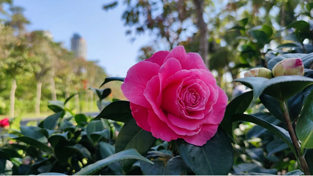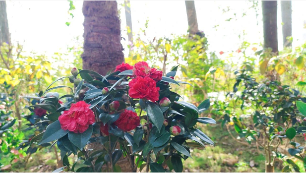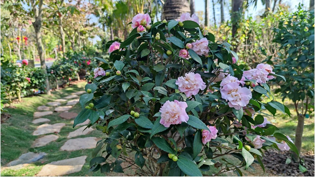 盛開的山茶花恍如赤霞彩云飄,葉片濃綠而有光澤,花形艷麗繽紛,嬌艷的茶花氣味芳香襲人,為海天公園增添了濃郁的年味~