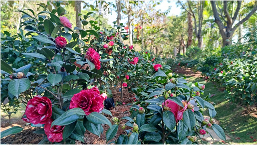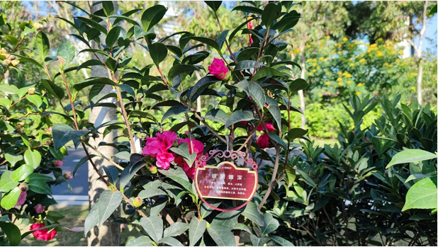 海天公園茶花園位于公園木棧道(海天中路至溫室植物園段)近梅華路一側(cè),長約200米,由1700余株茶花樹組成,包含夢十三、太陽頌、伊莎安妮、迷茫的春天、寶貝夫人、赤丹紅等近200個品種。