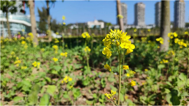 春日里的海天公園樹木蔥郁、花繁草盛,由3萬株油菜花組成的油菜花海、2.5萬株波斯菊組成的波斯菊花海,以及600棵勒杜鵑精心的打造的勒杜鵑園,營造出花團(tuán)錦簇,綠意盎然,生機勃勃的活力景象。此外,朱槿、比利時杜鵑、劍麻、藍(lán)色半邊蓮、花葉太陽花等,為翠綠的公園增添了多彩點綴。