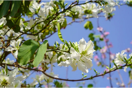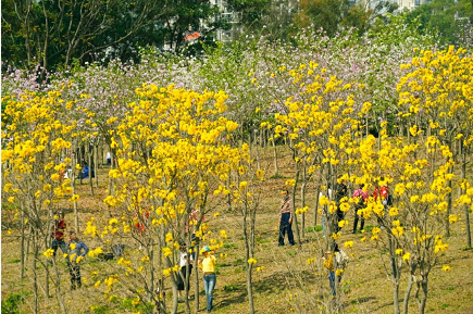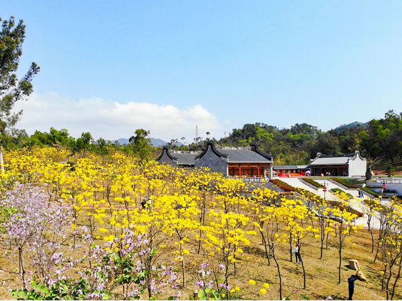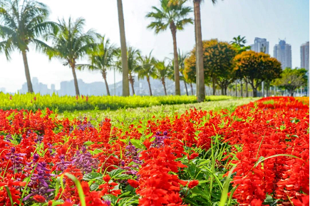 在輕柔的海風(fēng)中,海天公園仿佛一幅絢爛的油畫,木棉吐出了花蕊,宮粉紫荊露出了紅粉,茶花、勒杜鵑競(jìng)相盛放,黃花風(fēng)鈴木花團(tuán)錦簇,嬌艷如繁星般點(diǎn)綴整個(gè)公園。
