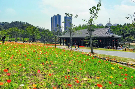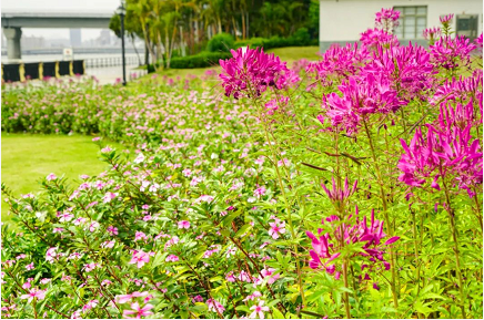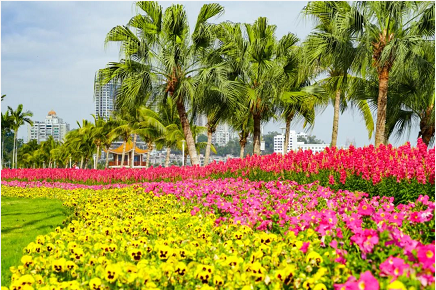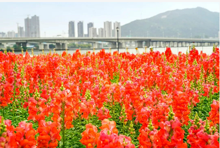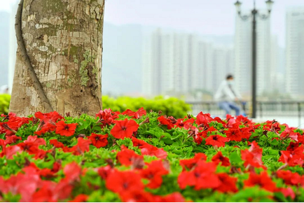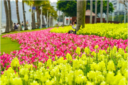春光燦爛,如詩如畫,一串紅、一串紫、醉碟、三色瑾、孔雀草、波斯菊,裝點(diǎn)在情侶路這條碧綠絲帶上。
