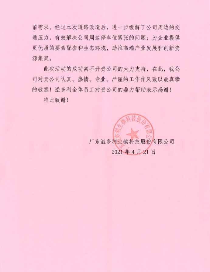 4月21日,廣東溢多利生物科技股份有限公司為珠海正方南屏科技生態(tài)城投資有限公司(以下稱正方生態(tài)城公司)送來一面錦旗和一封感謝信,為正方生態(tài)城公司的專業(yè)水平和匠心精神點(diǎn)贊,并致以誠摯的謝意,同時(shí)也見證了正方控股作為區(qū)屬國企為助推南屏科技生態(tài)城的發(fā)展升級發(fā)揮的重要作用。