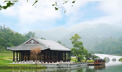 “洗心”水榭采用了傳統(tǒng)歇山頂構(gòu)造,坐落于香山湖公園二期中最為開闊的水面之上,與六角重檐亭“眾樂亭”形成對景。置身其中,在“洗心”水榭觀望山湖景色,微風(fēng)輕撫,洗去疲憊,靜下心來,在澄澈空靈的氛圍下,精神飽滿地賞嶺南之風(fēng)情,游山湖之樂趣。
