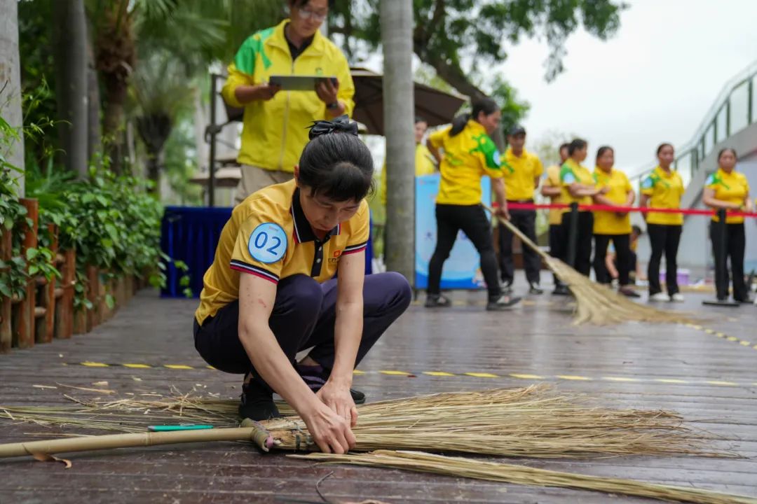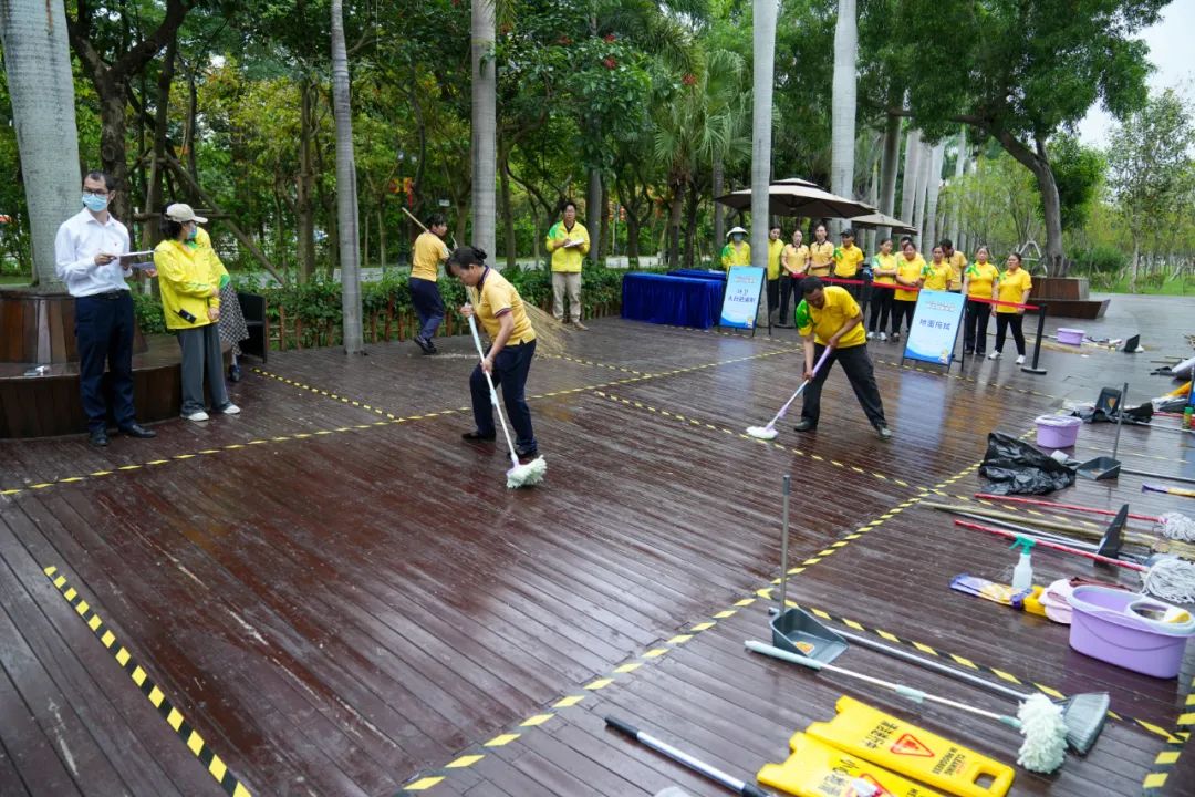 保潔組競賽分“自我形象展示”、“知識必答”、“實(shí)操演示”三個(gè)環(huán)節(jié)進(jìn)行。6組隊(duì)伍在進(jìn)行風(fēng)采展示后,展開了激烈的知識問答比拼。面對清潔劑配比、不同擦拭布與清潔劑的使用場景等提問,參賽選手應(yīng)對自如,從容作答。實(shí)操環(huán)節(jié)中,選手們展示了刮拭玻璃、拖掃落葉、編制大掃把等技能,表現(xiàn)出了優(yōu)秀的專業(yè)技能水平。