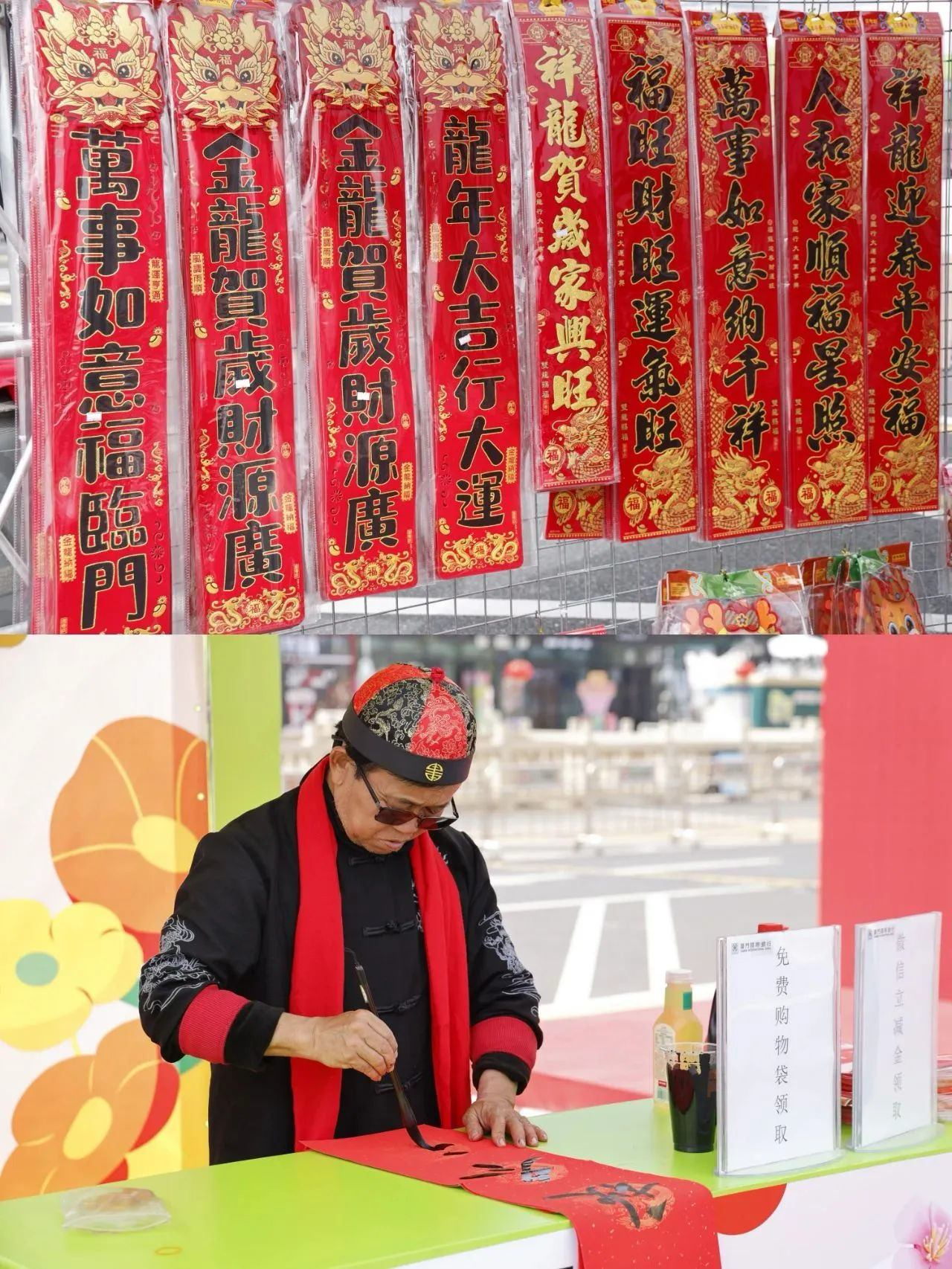 在揮春送福攤位上,書(shū)法老師揮毫潑墨,將新春的祝福凝入筆端,