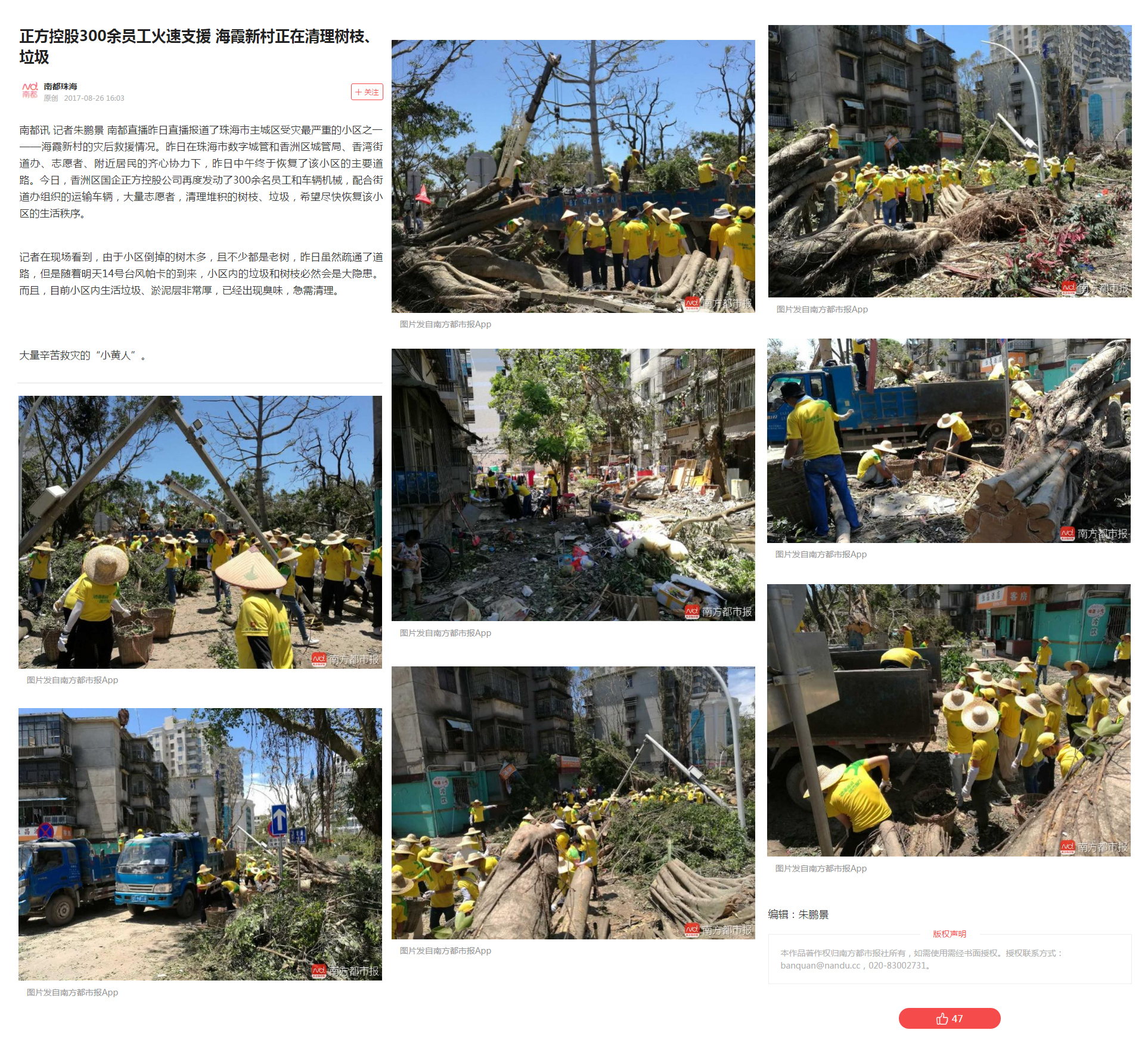 南方都市報(bào):正方控股300余員工火速支援 海霞新村正在清理樹(shù)枝、垃圾