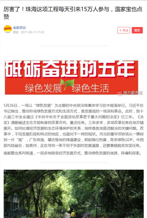 南方都市報(bào):厲害了!珠海這項(xiàng)工程每天引來(lái)15萬(wàn)人參與,溫家寶也點(diǎn)贊 2017-08-11 南方都市報(bào):厲害了!珠海這項(xiàng)工程每天引來(lái)15萬(wàn)人參與,溫家寶也點(diǎn)贊 返回列表 上一篇:珠海特區(qū)報(bào):社區(qū)公園好玩嗎?未來(lái)三年珠海將再添160個(gè)社區(qū)公園 下一篇:南方都市報(bào):正方控股300余員工火速支援 海霞新村正在清理樹(shù)枝、垃圾