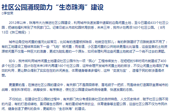 珠海特區(qū)報:社區(qū)公園涌現(xiàn)助力“生態(tài)珠?!苯ㄔO(shè) 2017-08-15 珠海特區(qū)報:社區(qū)公園涌現(xiàn)助力“生態(tài)珠?!苯ㄔO(shè) 返回列表 上一篇:珠江晚報:把綠地福利帶到市民家門口未來三年珠海再添160個社區(qū)公園 下一篇:珠海特區(qū)報:社區(qū)公園好玩嗎?未來三年珠海將再添160個社區(qū)公園