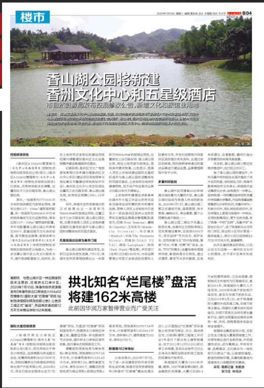 其中,一處面積為77718.81平方米的地塊確定為旅館業(yè)用地,停車位按0.3個(gè)/100m2建筑面積配置。另一塊面積為25004.51平方米的地塊確定為文化設(shè)施用地,停車位按1.0個(gè)/100m2建筑面積配置,并補(bǔ)充配置香山湖公園公共停車位360個(gè),配套設(shè)施為文化活動(dòng)設(shè)施、圖書展覽設(shè)施等。按照該單元(香洲區(qū)A102e02管理單元(文化中心及酒店項(xiàng)目))早前的控制性詳細(xì)規(guī)劃修改批前公告顯示,為進(jìn)一步完善公園片區(qū)公共文化服務(wù)水平,提升旅游配套能力,經(jīng)研究,擬在土地利用總體規(guī)劃的建設(shè)用地范圍內(nèi)調(diào)整增加香洲區(qū)文化設(shè)施規(guī)模并建設(shè)高端園林式酒店。