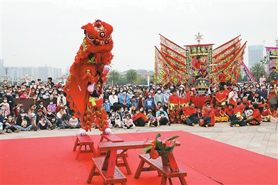 本報(bào)訊(記者康振華)咚咚鏘、咚咚鏘……鏗鏘有力的鑼鼓陣陣響起,一條條錦色長(zhǎng)龍翻騰起舞。昨日,香洲區(qū)南屏鎮(zhèn)華發(fā)商都廣場(chǎng)上人頭涌動(dòng)、喝彩聲陣陣,南屏鎮(zhèn)第二屆珠澳龍獅文化節(jié)的第二場(chǎng)大戲熱鬧登場(chǎng),精彩的舞龍醒獅表演一展嶺南傳統(tǒng)龍獅文化的風(fēng)采,寓意國(guó)泰民安的喜慶鼓點(diǎn)催人振奮。