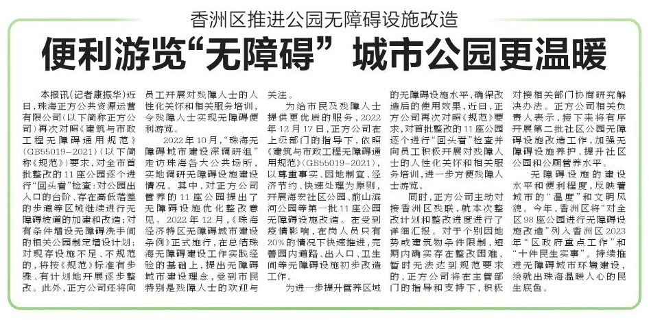 2022年10月,“珠海無障礙城市建設(shè)深調(diào)研組”走訪珠海各大公共場(chǎng)所,實(shí)地調(diào)研無障礙設(shè)施建設(shè)情況。其中,對(duì)正方公司管養(yǎng)的11座公園提出了無障礙設(shè)施優(yōu)化整改意見。2022年12月,《珠海經(jīng)濟(jì)特區(qū)無障礙城市建設(shè)條例》正式施行,在總結(jié)珠海無障礙建設(shè)工作實(shí)踐經(jīng)驗(yàn)的基礎(chǔ)上,提出無障礙城市建設(shè)理念,受到市民特別是殘障人士的歡迎與關(guān)注。