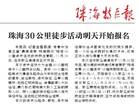 本報訊 記者金璐報道:有意參加第五屆“最美海岸·珠澳同行”珠海30公里徒步活動的市民注意啦,11月28日,活動報名通道將正式開啟。