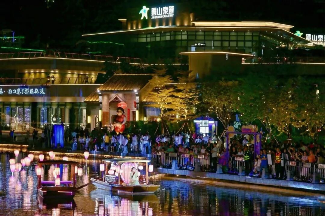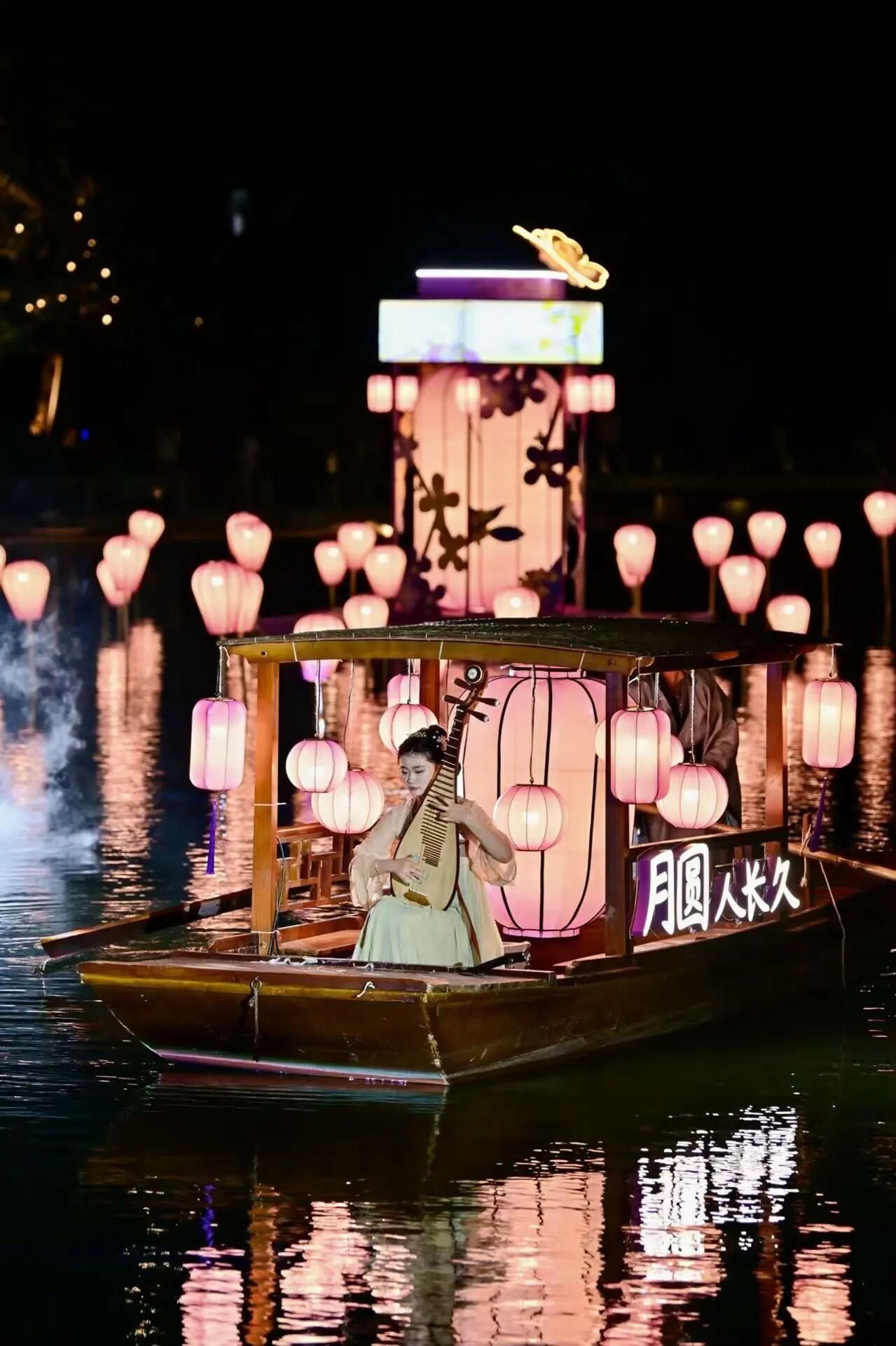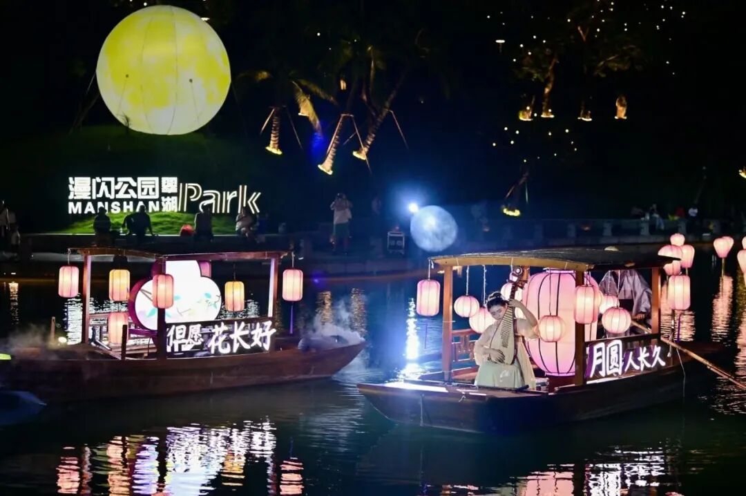 10月2日晚,夜色漸濃,正方優(yōu)和匯·城市陽臺中秋宮廷花燈會的百余盞宮廷花燈,在翠湖岸邊驟然點(diǎn)亮。華燈初上時,暖黃、柔粉等各色燈光透過紗絹燈罩漫開,在湖面映出搖曳的光影。湖心上緩緩駛過一艘小船,琵琶演奏者在船上指尖輕撥,樂聲伴燈影浮動。這片兼具古樹、疊石、湖心亭的嶺南特色水岸,瞬間化作古意盎然的“光影秘境”,引得市民游客紛紛駐足、打卡記錄。
