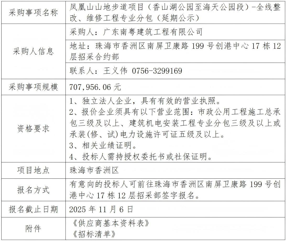 鳳凰山山地步道項(xiàng)目(香山湖公園至海天公園段)-全線(xiàn)整改、維修工程專(zhuān)業(yè)分包(延期公示) 專(zhuān)欄:工程招標(biāo) 發(fā)布日期: 2025-11-03 作者:招采管理中心 附件:供應(yīng)商基本資料表 附件:鳳凰山山地步道項(xiàng)目(香山湖公園至海天公園段)-全線(xiàn)整改、維修工程招標(biāo)清單 返回列表 上一篇:廣昌保障房配套基礎(chǔ)設(shè)施項(xiàng)目施工總承包-混凝土材料采購(gòu) 下一篇:香山湖酒店-剩余產(chǎn)值建筑施工企業(yè)安全生產(chǎn)責(zé)任保險(xiǎn)、建筑工程一切險(xiǎn)服務(wù)